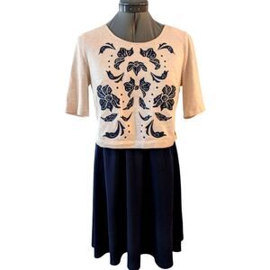 - sleeveless satin navy blue slip dress with short sleeve embroidered cutout sweater top