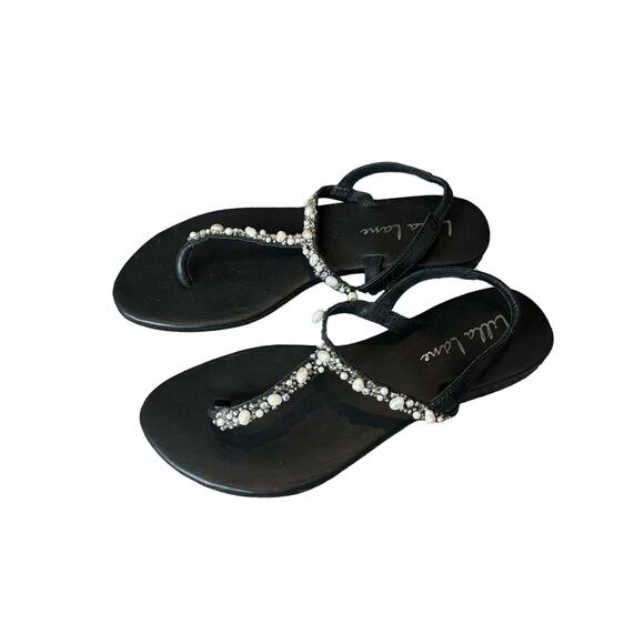 Pre owned. Wear on bottom. Padded footbed. Leather upper. Hand seem. Farm cultured pearls. Crystals. Elastic heel strap.
