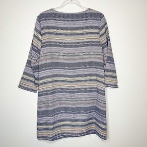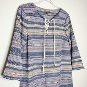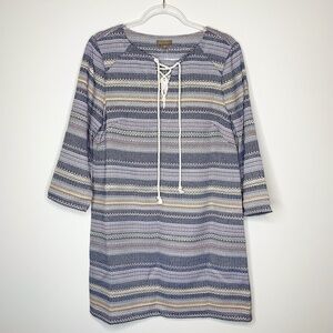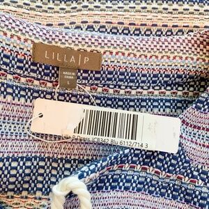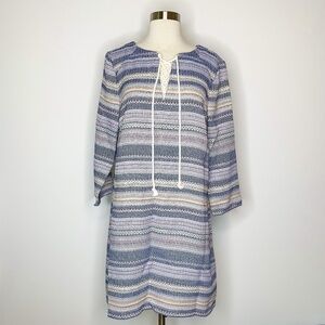 Lilla P Dress Women Large Woven Jacquard Tie Chest NWT 3/4 Sleeve Blue Cream