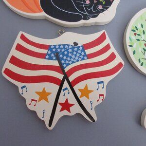 This is a wonderful set of 7 wooden plaques that are designed for door or wall decor from the ever-popular Lillian Vernon. They are seasonal plaques that can be used for multiple Holidays. There is a Snowman/Christmas Tree, Easter Egg/Chick, Spring Flowers with Bumble Bee, USA Flag, House, Fall Trees, and Pumpkin/Black Cat.