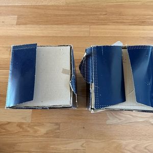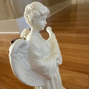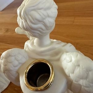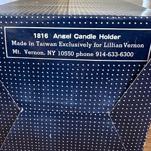 Lillian Vernon Angel Playing Mandolin Lute Candle Holders 10" Pair White #1816. Each candlestick comes in its original box. Pair of ceramic 10" angels playing a mandolin, or lute, that doubles as a candlestick holder. Can be used as a stand alone figurine or as candlestick holders. Each angel is in perfect condition with no chips or cracks. Some wax residue on inside and lip of candle holder. In pictures, discoloration around lip is wax, not peeling of gold paint. I have rubbed the wax off since taking pictures and there is no discoloration to the gold rim of the candle holder. Each comes with its original box and styrofoam inserts from Lillian Vernon. Made in Taiwan. Please see pics for condition of box-tops have been torn. Span of widest point: 4 1/2", and height is 10".