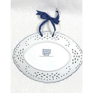 The Lillian Vernon Blue White Rooster wall hanging Platter is a beautiful decorative piece made of ceramic, featuring a glossy finish and rustic farmhouse style. This vintage item, originating from America in the 1980s, showcases an oval shape with intricate rooster cutouts in blue and white colors. Perfect for all occasions, this decorative plate adds a touch of charm to any space and is easy to care for with machine washable instructions. The Lillian Vernon brand ensures quality and craftsmanship in this unique and original piece of art pottery.