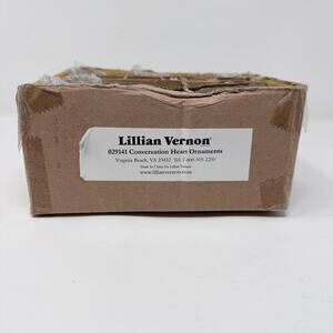 Lillian Vernon Pastel Candy Conversation Hearts Blown Glass Valentine's Day Ornaments. A set of 12 sweet Valentine's Day conversation heart ornaments in pink, purple and green with an subtle metallic glaze. Painted on both sides of the hearts with the sayings, "I'm Yours", "Hug Me", "Kiss Me" and "You're Sweet". Each ornament has a silver cord hanger. Each ornament will come to you in their own bubble wrap pouch and in a corrugated cardboard open top box.