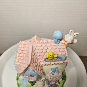 Very sweet, Lillian Vernon Easter schoolhouse. It has a windup key on the bottom. And plays Easter parade. Stands four and half inches tall. 5 inches wide. Backside of this egg has a little bit of yellowing but does not affect its beauty. See my photos. And for this reason I have lowered the price. Non-smoking pet free home.