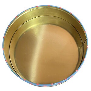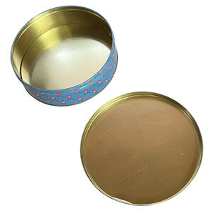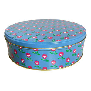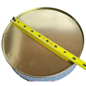 This vintage Lillian Vernon tin trinket box is a charming addition to any room. With a lovely blue color and red flowers, it's perfect for all occasions and adds a touch of country cottage style to your decor. The tin measures 2.5 inches in height and 8 inches in diameter, making it the perfect size for storing extra buttons, craft items, jewelry, paper clips, or other small items. Add this Lillian Vernon tin/ trinket box to your collection today!
