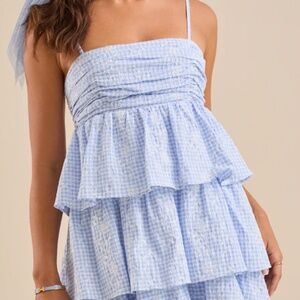 The Lilliana Mini Dress features a charming blue gingham pattern, complemented by delicate floral embroidery. This playful dress is perfect for sunny days, blending fun and femininity effortlessly.