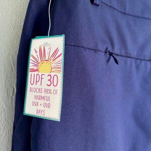 UPF 30- Blocks 98% of harmful UVA + UVB Rays. 2 Front pockets, 2 zippered rear pockets. 97% Polyester, 3% Spandex.
