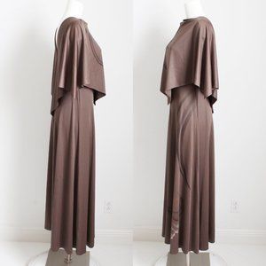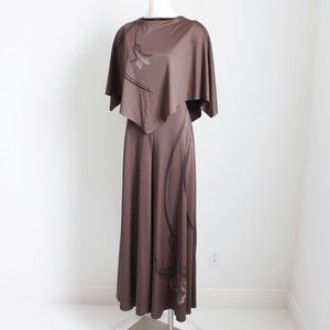 Preowned, vintage Lillie Ruben jumpsuit, likely made in the mid 1970s. Made from taupe-hued brown jersey fabric with a simple floral print, it features an attached caplet at the bodice, a V-back, and wide leg, palazzo style pants!
