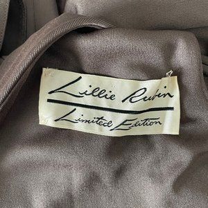 Tagged LILLIE RUBEN LIMITED EDITION (launched in 1975). No content label, feels like a poly or poly-blend fabric. Dry clean recommended. Fastens in back with a zipper.