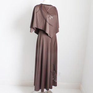 Preowned, vintage Lillie Ruben jumpsuit, likely made in the mid 1970s. Made from taupe-hued brown jersey fabric with a simple floral print, it features an attached caplet at the bodice, a V-back, and wide leg, palazzo style pants!