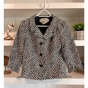 Vintage Lillie Rubin 2-piece skirt suit in 100% silk. Features black and white polka dots, a tailored jacket with three-button front, and a matching skirt with ruffle hem. Size 6. Timeless and elegant set perfect for evening wear, retro events, or vintage fashion collectors.