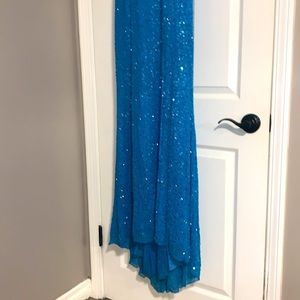 Lillie Rubin blue/ turquoise strapless Vintage mermaid style dress. Front slip, longer train in back. Zippers from back with also 3 settings across back bra area. RETRO 2002 dress!