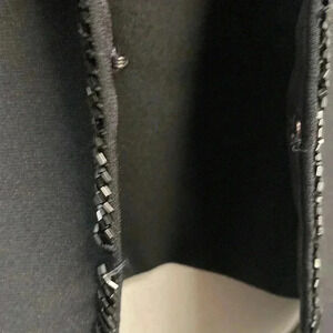 Amazing three piece beaded trim suit. Tri acetate polyester - acetate lined suit - jacket & shirt have beaded trim - one spot where a few beads missing on jacket - pictured and easy fix. Hook & eye closure. Shirt sleeveless beaded around neck. Fitted and zipper back. Skirt one button zipper back closure. Two elastic panels on sides of back waist. Back slit. Beautiful suit - was worn once in the 80’s to a formal wedding - still a classic - needs cleaning. I do not dry clean my price reflects that. Measurements Laying flat: