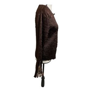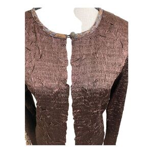 Lillie Rubin open cardigan crinkle style fabric with unique leaves cuff pattern. Brown trim gold. Size large short cardigan. Womens.