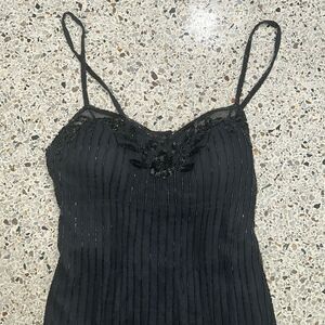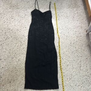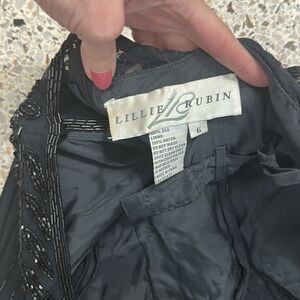 EUC vintage Lillie Rubin black beaded embellished black tie dress gown maxi 100% silk vintage size 6 fits like a 4. Please see measurements note: beads missing in a couple of spots pointed out in last 3 pics