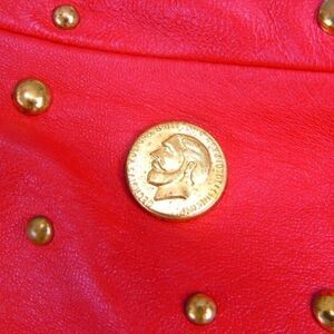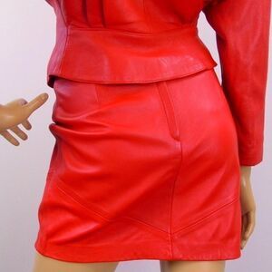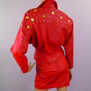 Roaring 80's Rad Fashion ! Red Genuine Leather Studded Skirt and Jacket . Rockabilly Suit - Mini Skirt & Strong Shoulder Silhouette Jacket With 1980's Shoulder Pads . Fire Truck Red / Fully Lined In Coordinating Color . Short One Button Jacket With-Studs & Faux 1916 British One Penny Coins ( King George V ) . Front And Back Pleats With Loose Fitting Bust Cut . Mini Skirt Features A Line Cut / Back Zipper & Snap Button Closure . Skirt Sz 4 Jacket Sz 6. Small stains & leather scratch shown in pics. Measurements Laid Flat :
