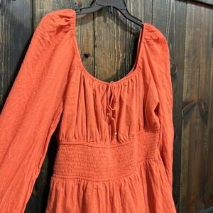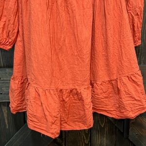 Lillusory brand boho mini dress. Size x-large. Orange. Y2K style. Peasant / Babydoll top with ruffle hem. Bowtie squared neckline. Slightly puffed sleeves. Smocked waist. Stretch material. Cotton. Great for all seasons. Pair with sandals or boots. Preloved. Please see all photos for condition.