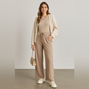 Lillusory Women Beige Elastic Band Drawstring Wide Leg Pants Boho Leisure Sz XL