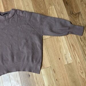 Lovely boxy sweater in a great neutral taupe color size XL. Great crewneck. Wrists and waist have smaller ribbing which is a sweet detail. Sides have slits in them!