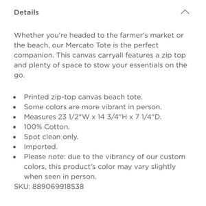 Whether you're headed to the farmer's market or the beach, Mercato Tote is the perfect companion. This canvas carryall features a zip top and plenty of space to stow your essentials on the go.