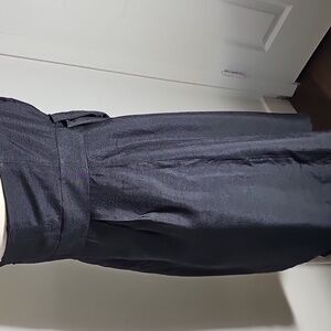 This elegant black strapless dress features a chic bow detail, perfect for any occasion. Its timeless design ensures you stand out with sophistication. style #70263. Pleating in front and back. completely lined. strap in the interior to help keep up. Back zipper and hook and eye. very flattering silhouette. Size 4. pit is to pit flat measurement is 15". The top to bottom length is 28". 100% viscose, however, looks like linen.