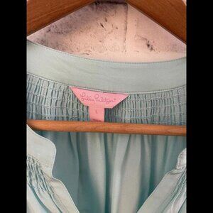 Women’s. Lilly Pulitzer. Shorely Blue. Elsa blouse. V-neck . Gold buttons. 100% silk. Like new condition. Size Large.