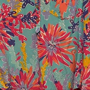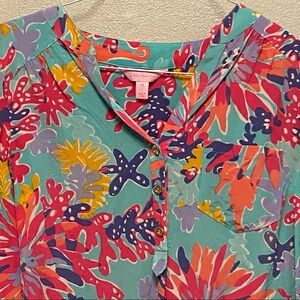 Beautiful Lilly Pulitzer silk blouse floral popover Henley blouse with roll-tab sleeves. Features vibrant floral print, lightweight silk fabric, and a relaxed fit. Perfect for effortless elegance in any season. Great for work, vacation or the beach.
