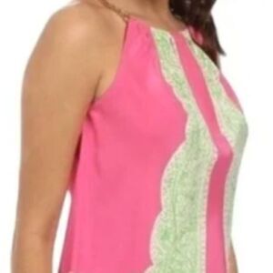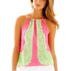 Lilly Pulitzer 100% Silk Riviera Gold Chain Halter Top Size Small Pink & Green