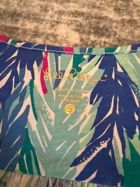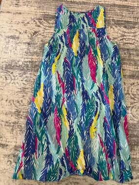 Lilly Pulitzer Shift Dress in a vibrant multi-color feather print. Women's size Small, sleeveless V-neck design. Made from 100% Pima Cotton, this dress offers a soft and lightweight feel perfect for summer or resort wear. Features a bold pattern with shades of blue, pink, teal, and yellow. Excellent pre-owned condition with no visible signs of wear.