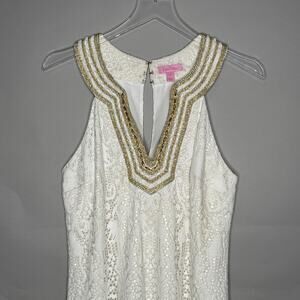 Lilly Pulitzer 8 Calera Jungle White Lace Gold Beaded Shift Dress Preppy