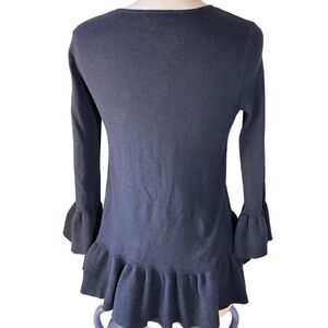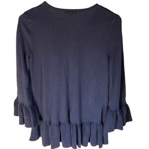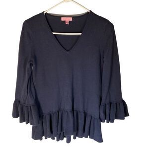 Adorable Lilly Pulitzer Adela Ruffle Sweater. Navy blue. Size Small. Statement ruffle sleeves and hem. Very slight pilling. Lightweight, 3/4 ruffle sleeves. V neck. 65% cotton, 30% modal, 5% wool. Flat lay 24” L, 17”. #lilly #preppy #coastalgrandma