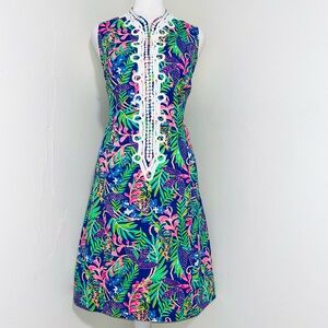 Lilly Pulitzer Alexa Stretch Shift Dress. Front & Back Zip, beautiful lace ouline. One of the prettiest patterns I’ve seen with Lilly! Perfect Vacay dress! Wore for a few hours to grad party.