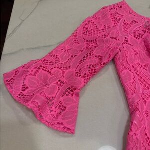 Lilly Pulitzer Allyson Dress in size 00. Bright Pink Tropics color in Floral Vines Lace pattern. Fully lined other than sheer lace top section and sleeves.