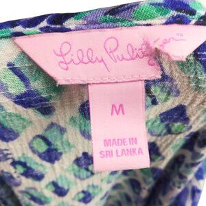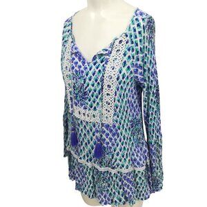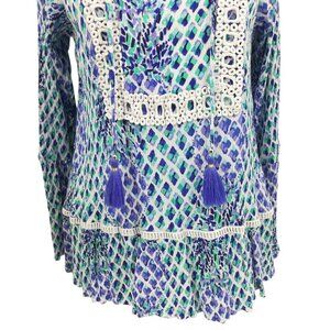 Lilly Pulitzer Amisa Top Size M Crochet Boho Bell Sleeves V-neck Tassel Blue