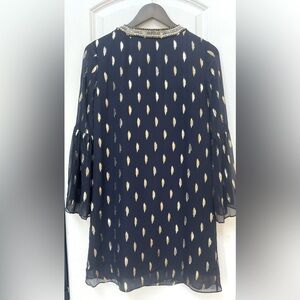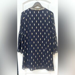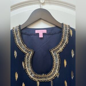 Lilly Pulitzer Amory Silk Shift Dress in Navy Blue and Gold. 91% Silk and 9% Metallic with a Full Polyester Lining except Sleeves are Sheer. Features a Jeweled Neckline and Bell Sleeves. Size 2 measures a 34” Chest x 33” Length from Nape. Sleeves are Bell Shaped and are 16” plus the 10” Bell Portion making it a total of 26”. Dress is in Excellent Used Condition. All beading and sequin in tact as far as I can see. No pulls in Silk. Dress is near pristine.