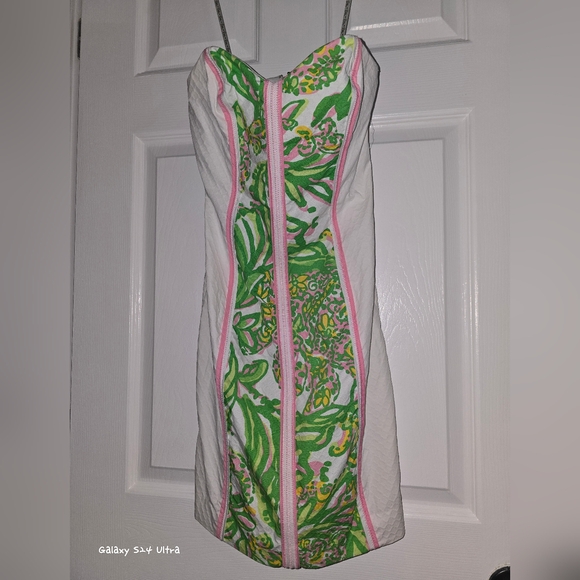 Chic strapless dress by Lilly Pulitzer. Features vibrant green floral pattern with pink detailing. Perfect for stylish outings.