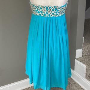 Very pretty aqua color strapless, pleated dress with gold detail at the top. Has a little pull in the back (see photo) but it is barely noticeable when on. Size 6 Lilly Pulitzer. Color is beautiful!! About 30 inches long. Could wear for prom or any special occasion!!