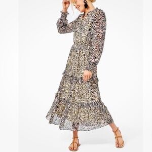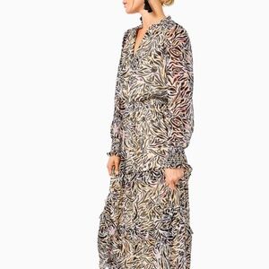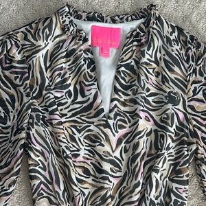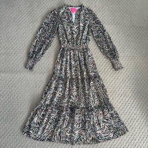 Lilly Pulitzer Ardith Midi Dress - Onyx Can You Zee Me Animal Print - Size 2 - Feminine/Versatile. This gorgeous Lilly Pulitzer midi dress features a v-neckline with ruffle collar, long sleeves with smocked elastic cuffs, midi length, a bold zebra print in shades of tan, charcoal, cream, pink, and vertical gold metallic thread throughout, smocked elastic waist, tiered skirt with ruffle detail, fully lined, and easy pullover styling. This dress is so comfortable and flattering, and perfect for both formal and casual events. Excellent pre-owned condition!