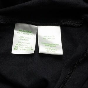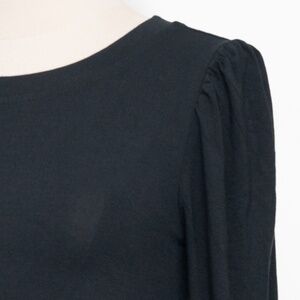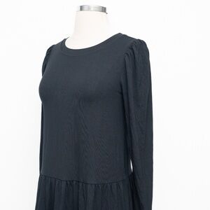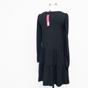 Long sleeve swingy jersey dress with a knee length tiered skirt and gold buttons at the cuffs.