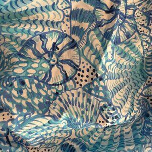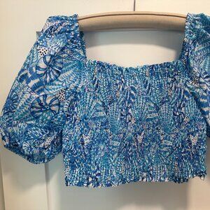 Amalfi Blue by the Seashore print. Fashioned from lightweight cotton poplin, this short top is a smocked puff sleeve top.