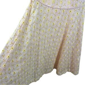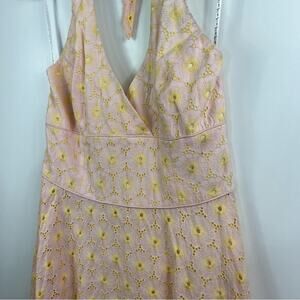 Elegant asymmetrical dress by Lilly Pulitzer. Soft pink with yellow patterns. Ideal for a fashionable statement.