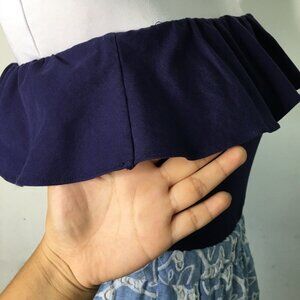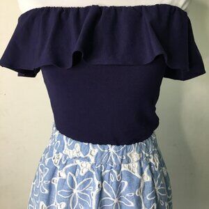 Lilly Pulitzer Athens Strapless A-Line Dress Color: Tide Blue Hollar for a Dollar Eyelet. Strapless A-line dress featuring solid bodice w/ chambray patterned skirt. Flounce ruffles at neckline. Elasticized waist. Fully lined. Bodice: 92% Cotton, 8% Spandex. Skirt: 55% Linen, 45% Rayon. Lining: 100% Cotton. Machine wash, line dry Measures approximately: 25 1/2” top to bottom; 8 1/2” from top to skirt, 17” from top of skirt to hem. 13 1/2” across top. Waist laying flat is 12" inches. Style#53084. Has small mark.