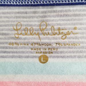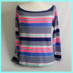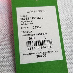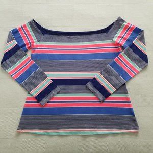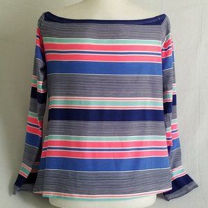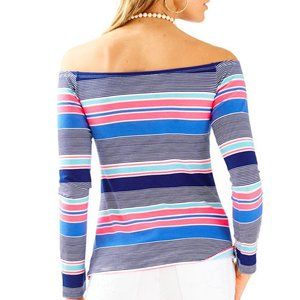 New With Tags ~ Lilly Pulitzer "Audelia" Women's Top Size Large. Bright Spring/Summer Colors in Blues, Pink and Aqua. "Kaleidoscope Jungle Stripe." Off-the-Shoulder and Long Sleeves. Very Lightweght. New and Never Worn. Details and Measurements (approximate and laying flat):
