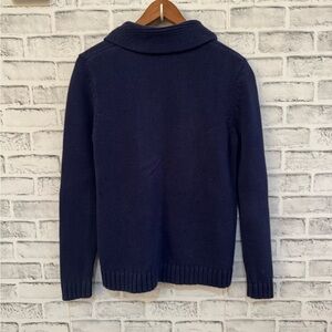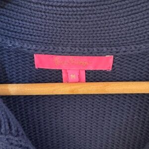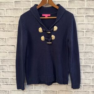 Women’s. Lilly Pulitzer. Blue collared sweater. Bainbridge. Gold toggle fasteners. Excellent condition. No stains or tears. Size Medium.