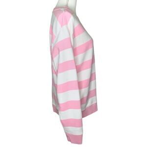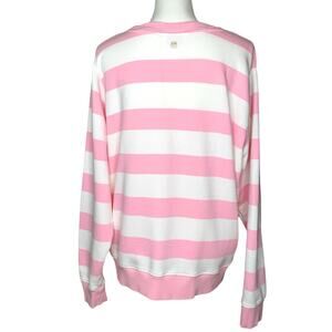 Lilly Pulitzer Ballad Pink and White Striped Sequin Palm Tree Crew Sweatshirt. Show your Lilly love in the relaxed fit, oversized Ballad Sweatshirt. It's all the comfort you'll need for the season. Features relaxed oversized fit, ribbed details at the crew neckline, sleeve cuffs, and hem band, custom front embroidered sequin beaded artwork, beach comber terry fabric. All photos except for modeled shots are of the actual item. Size L. Great condition, minor pilling. 100% cotton. Measurements (approximate): PTP 26", length 26", sleeve length 25.5". This style originally retailed for $124 and is no longer available.