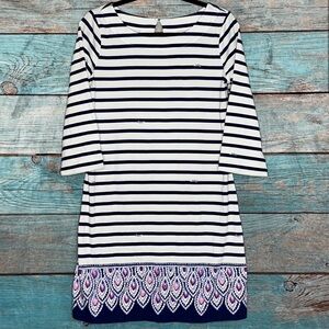 Lilly Pulitzer Bay dress. Size small. Serene striped. Navy blue & white. Nautical pattern. Design hem. Lilly logo throughout. Very cute 3/4 sleeves dress. Stretchy. Mini length. Preloved. Please see all photos for condition. Preppy. Coastal. Country Club. Keyhole button back.