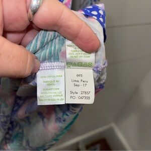 Quill Out print dress with long sleeves. Features blue, pink, and green hues.