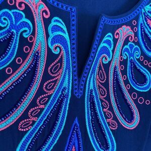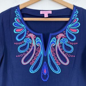 Women’s tunic size small. Lilly Pulitzer colors in beads around the neckline in navy blue background. Sleeves are 3/4. Excellent condition.