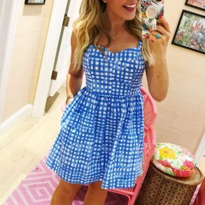 Step out in style with this preppy Lilly Pulitzer blue gingham dress. Perfect for any occasion, this dress offers a flattering fit and a trendy design.