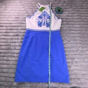 Coastal charm meets modern sophistication in this Lilly Pulitzer dress. A vision in bright blue and crisp white, this sleeveless shift dress features a unique halter neckline with a playful scalloped trim. The bodice is adorned with an intricate, eye-catching floral design, adding a touch of whimsy and elegance. The fitted silhouette flatters the figure, while the stretch fabric ensures a comfortable and flexible fit. Perfect for a summer garden party, a seaside brunch, or a chic evening out, this dress is sure to turn heads and make a statement.